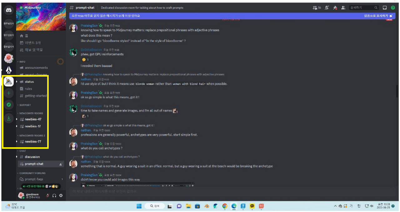 즉, 미드저니는 디스코드 채팅방 중 그림을 그려주는 채팅 창에